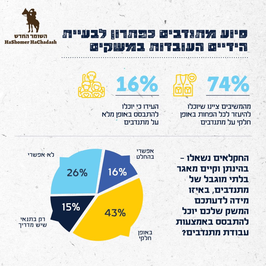 המדגם נערך על ידי שלמה פילבר וצוריאל שרון באמצעות דיירקט פולס בע"מ עבור ארגון השומר החדש בתאריך ה-21 בנובמבר 2023, באמצעות מערכת דיגיטלית בשילוב פאנל, בקרב 458 נדגמים בוגרים (18+) המהווים מדגם מייצג של חקלאים ובעלי משקים פעילים בישראל. טעות הדגימה הסטטיסטית 4.8% ± בהסתברות של 95%.
