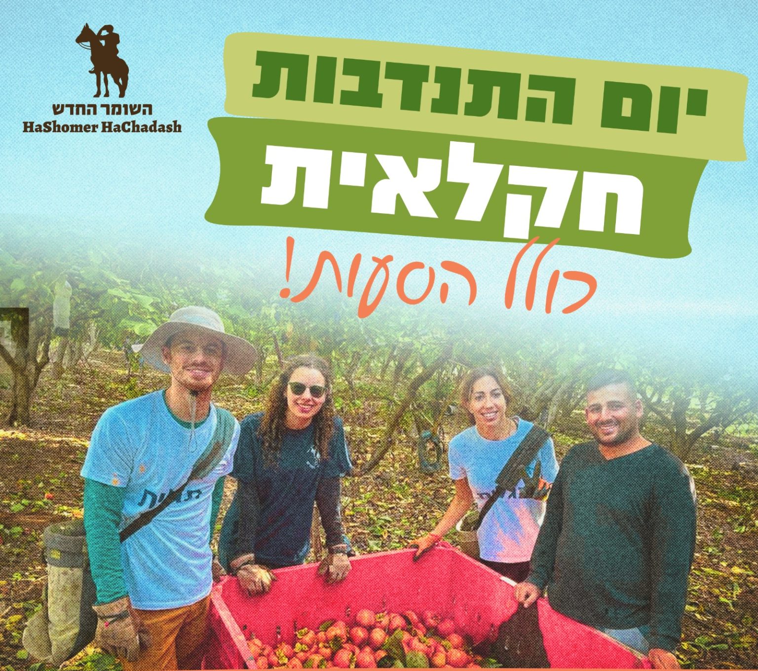 השומר החדש מזמין אתכם לקחת חלק ביום התנדבות חקלאית מיוחד שכולל הסעות! לקטנו עבורכם חקלאים שזקוקים לסיוע וישמחו מאוד שתגיעו לעזור. הפעילות מתאימה ליחידים, קבוצות ומשפחות